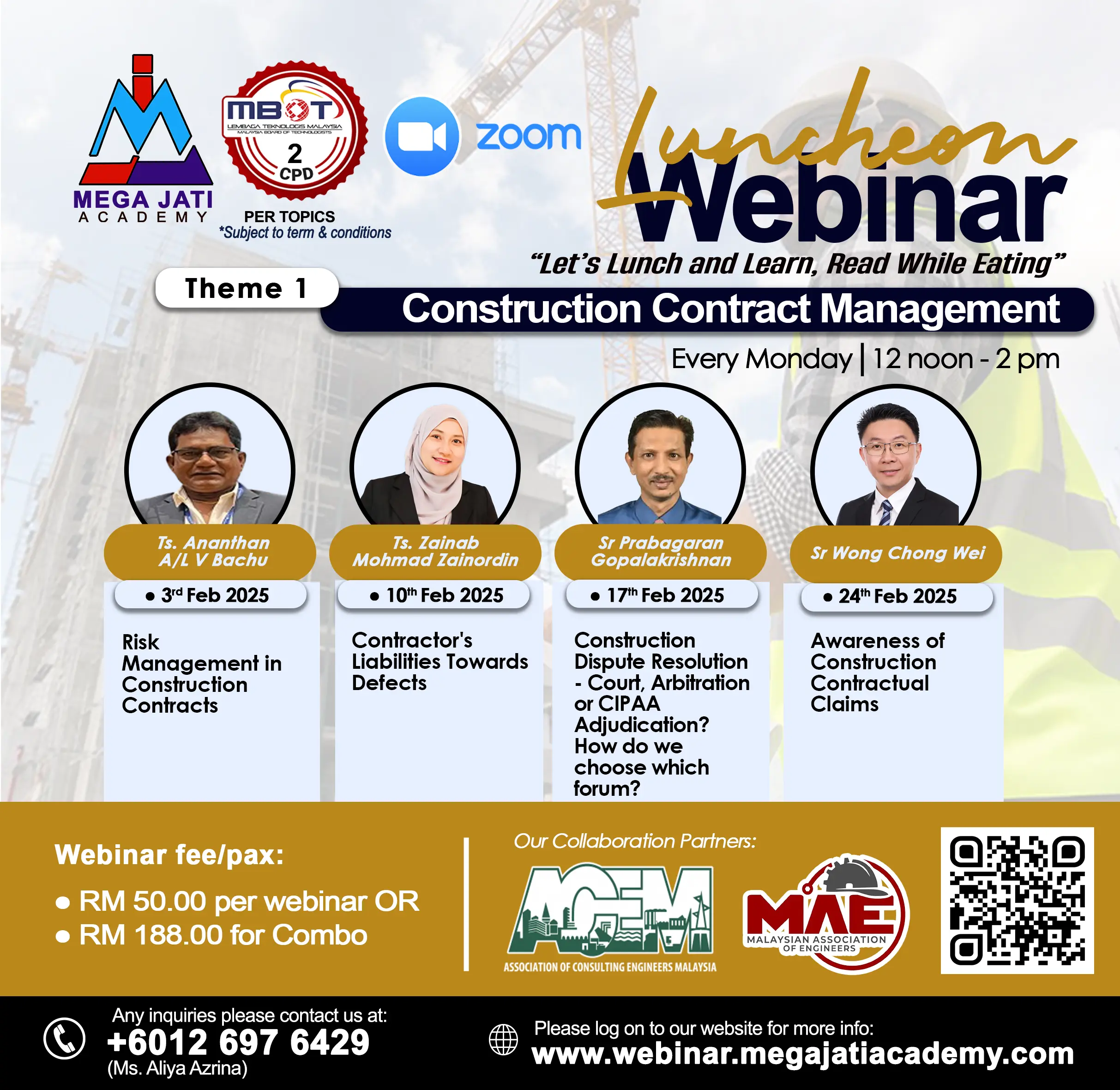 | Choose your webinar topics | 03 February 2025 – Risk Management in Construction Contracts, 10 February 2025 – Contractor's Liabilities Towards Defects, 17 February 2025 – Construction Dispute Resolution – Court, Arbitration or CIPAA Adjudication? How do we choose which forum?, 24 February 2025 – Awareness of Construction Contractual Claims, Combo Purchase for All topics |