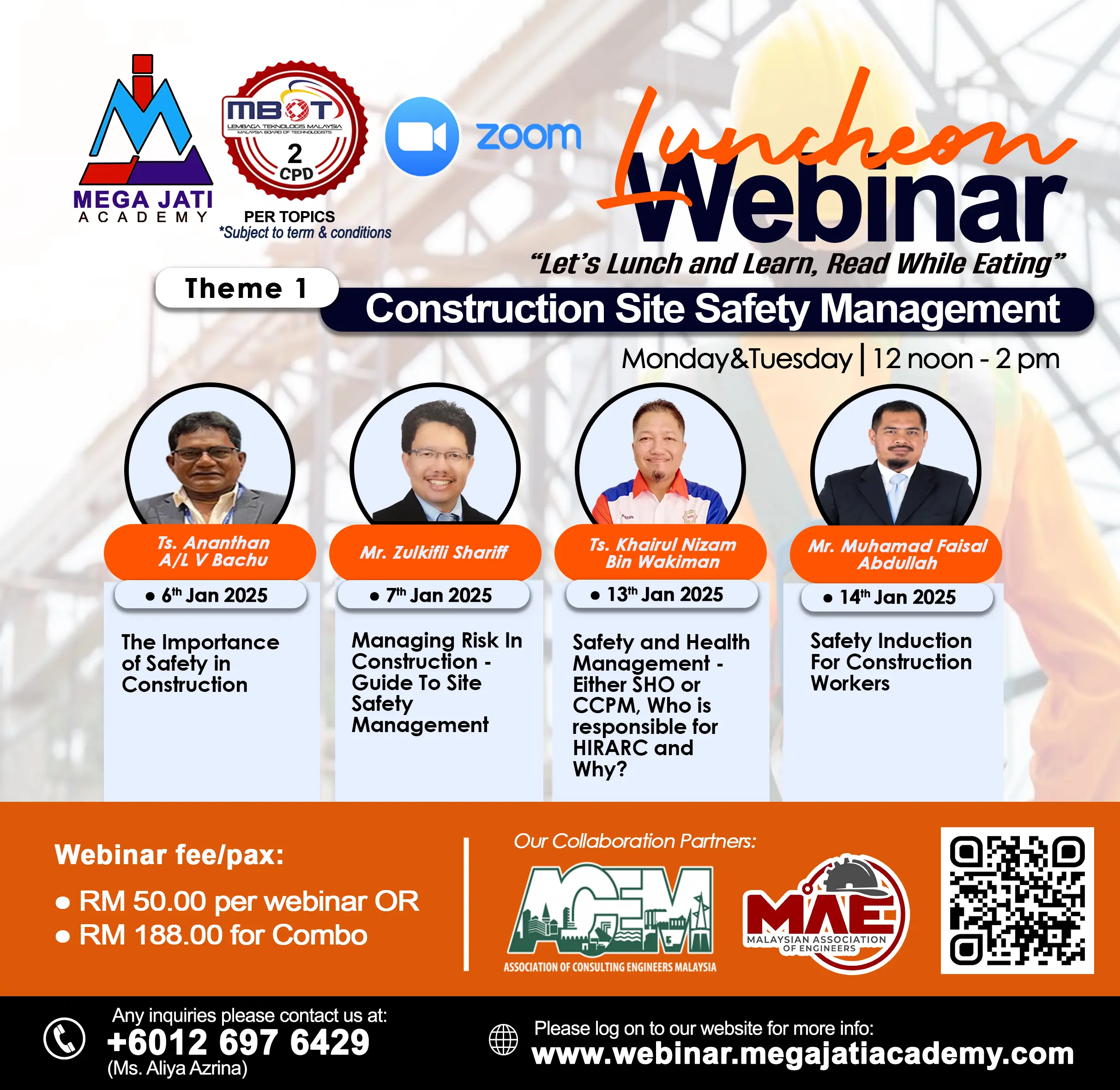 | Choose your webinar topics | 06 January 2025 – The Importance of Safety in Construction, 07 January 2025 – Managing Risk In Construction – Guide To Site Safety Management, 13 January 2025 – Safety and Health Management – Either SHO or CCPM, Who is responsible for HIRARC and Why?, 14 January 2025 – Safety Induction For Construction Workers, Combo Purchase for All topics |