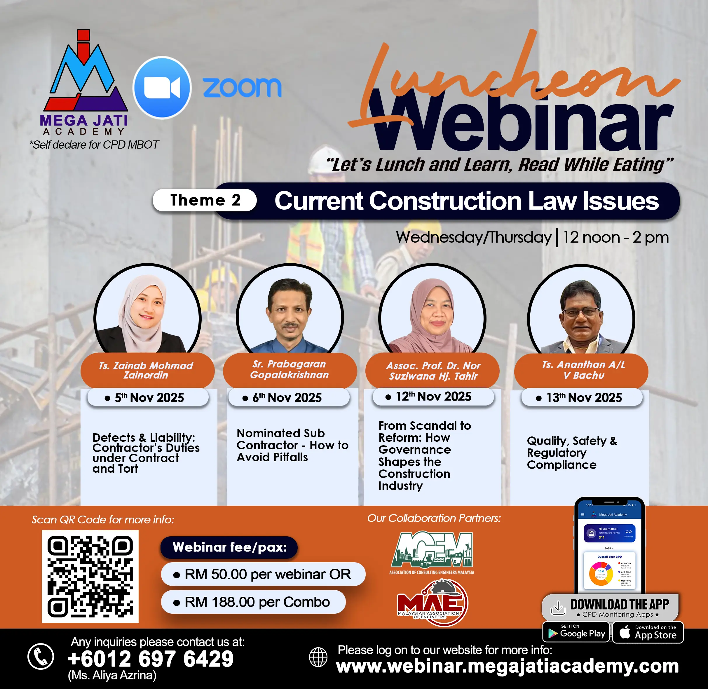 | Choose your webinar topics | 05 November 2025 – Defects & Liability: Contractor’s Duties under Contract and Tort, 06 November 2025 – Nominated Sub Contractor – How to Avoid Pitfalls, 15 November 2025 – From Scandal to Reform: How Governance Shapes the Construction Industry, 22 November 2025 – Quality, Safety & Regulatory Compliance, Combo Purchase for All topics  |