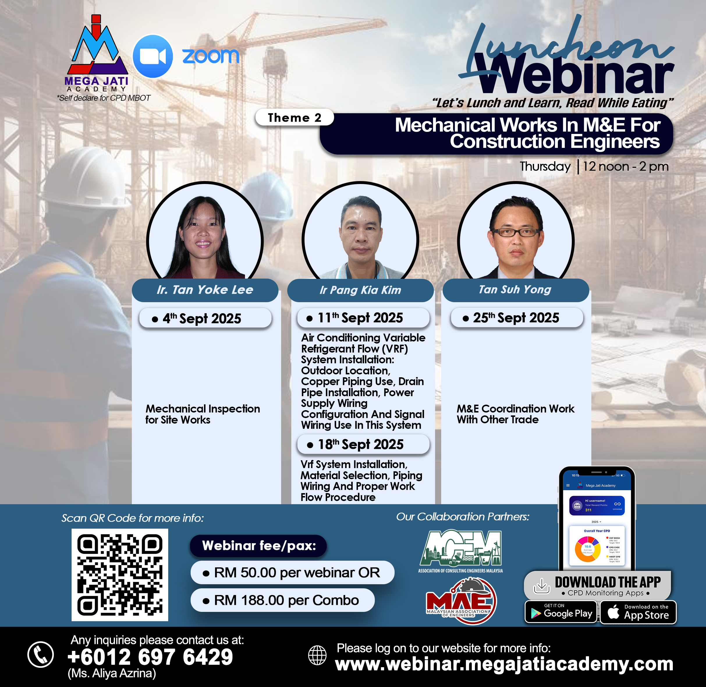 | Choose your webinar topics | 04 September 2025 – Mechanical Inspection for Site Works, 11 September 2025 – Air Conditioning Variable Refrigerant Flow (VRF) System Installation: Outdoor Location, Copper Piping Use, Drain Pipe Installation, Power Supply Wiring Configuration And Signal Wiring Use In This System, 18 September 2025 – Vrf System Installation, Material Selection, Piping Wiring And Proper Work Flow Procedure, 25 September 2025 – M&E Coordination Work With Other Trade, Combo Purchase for All topics |