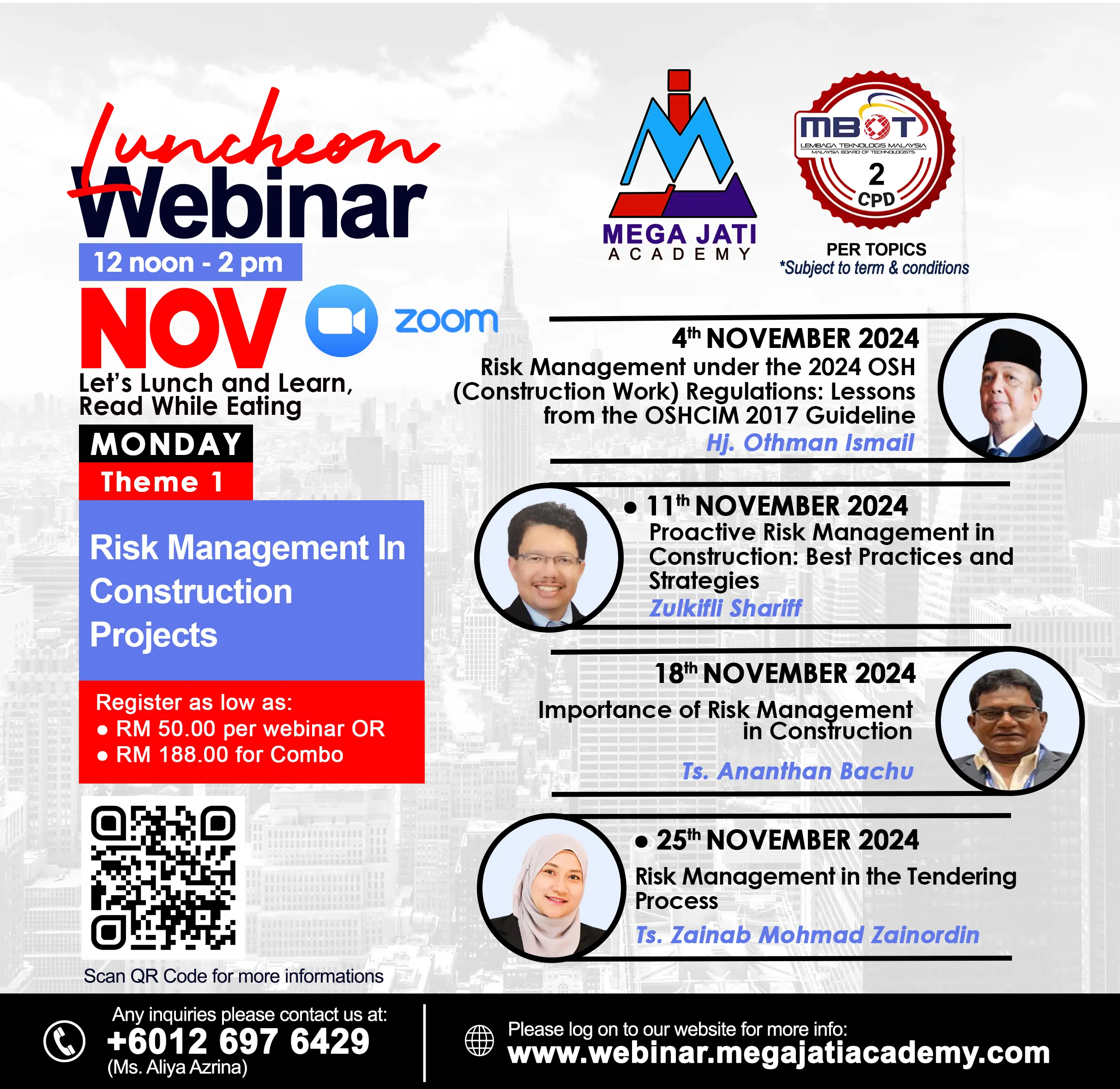 | Choose your webinar topics | 04 November 2024 – Risk Management under the 2024 OSH (Construction Work) Regulations: Lessons from the OSHCIM 2017 Guideline, 11 November 2024 – Proactive Risk Management in Construction: Best Practices and Strategies, 18 November 2024 – Importance of Risk Management in Construction, 25 November 2024 – Risk Management in the Tendering Process, Combo Purchase for All topics |
