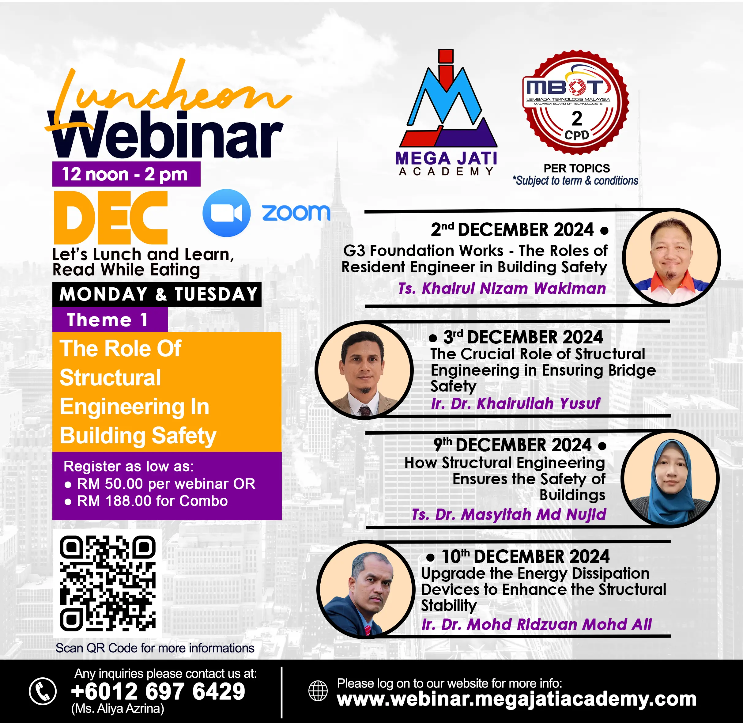 | Choose your webinar topics | 02 December 2024 – G3 Foundation Works – The Roles of Resident Engineer in Building Safety, 03 December 2024 – The Crucial Role of Structural Engineering in Ensuring Bridge Safety, 09 December 2024 – How Structural Engineering Ensures the Safety of Buildings, 10 December 2024 – Upgrade the Energy Dissipation Devices to Enhance the Structural Stability, Combo Purchase for All topics |